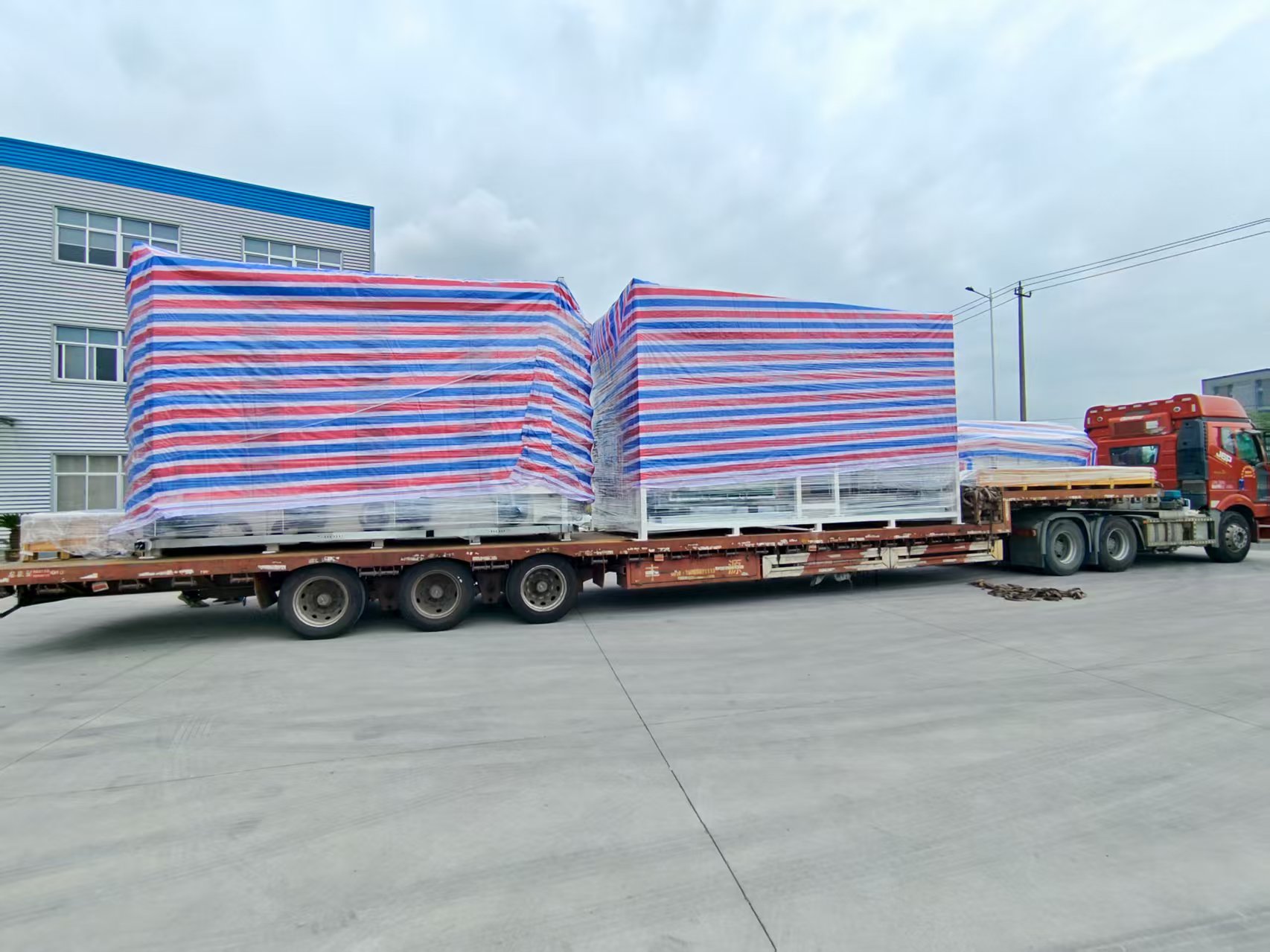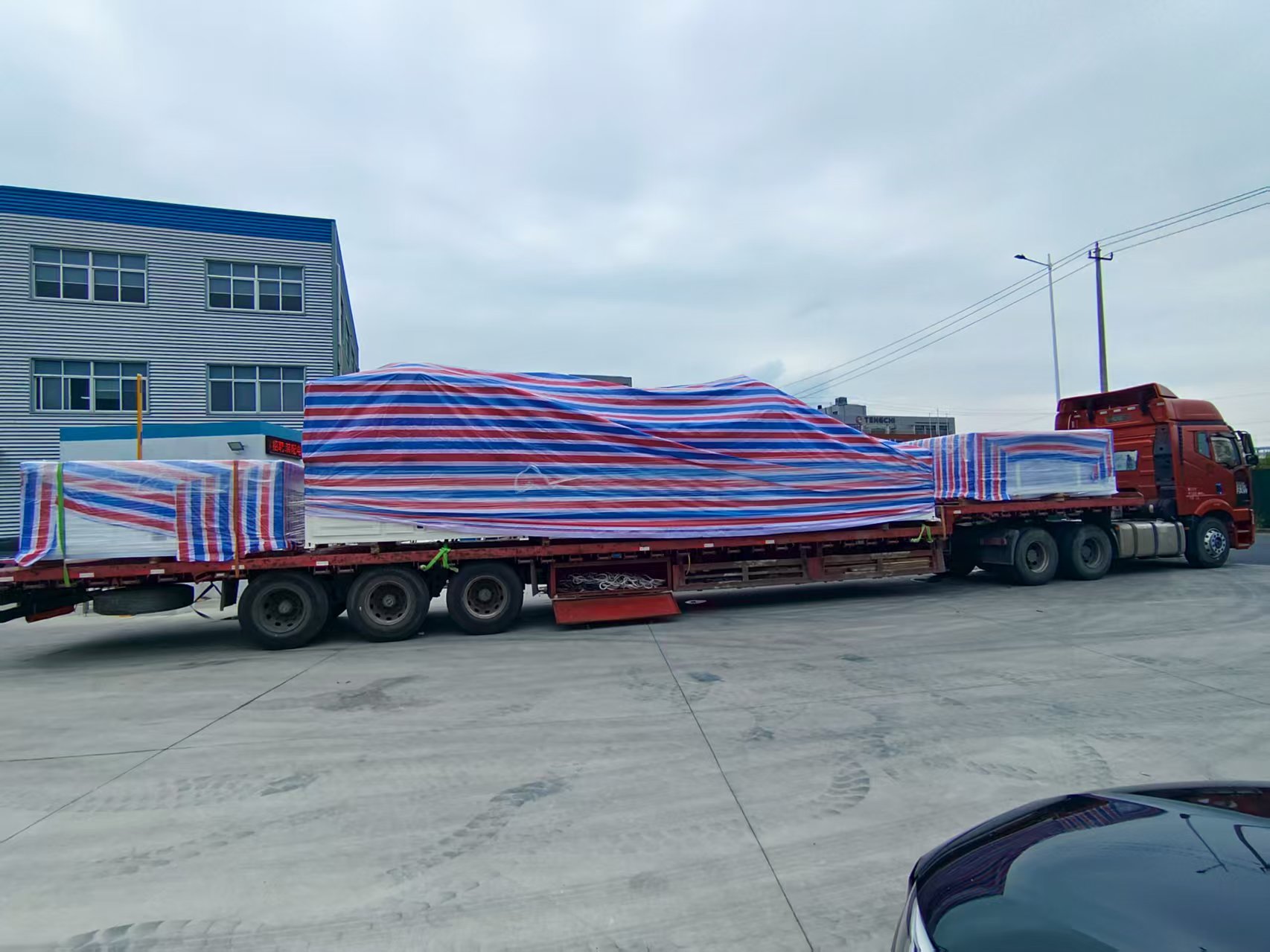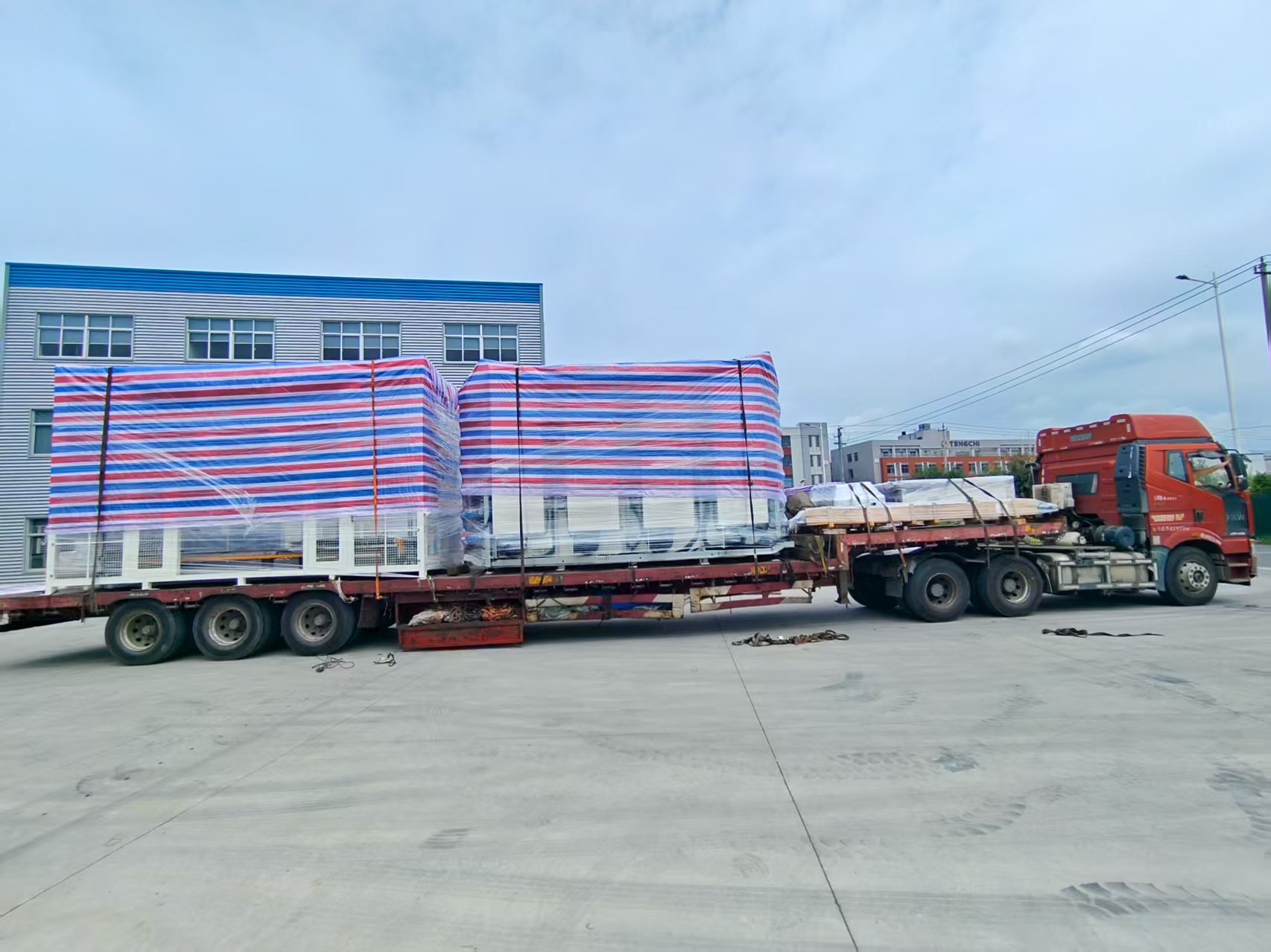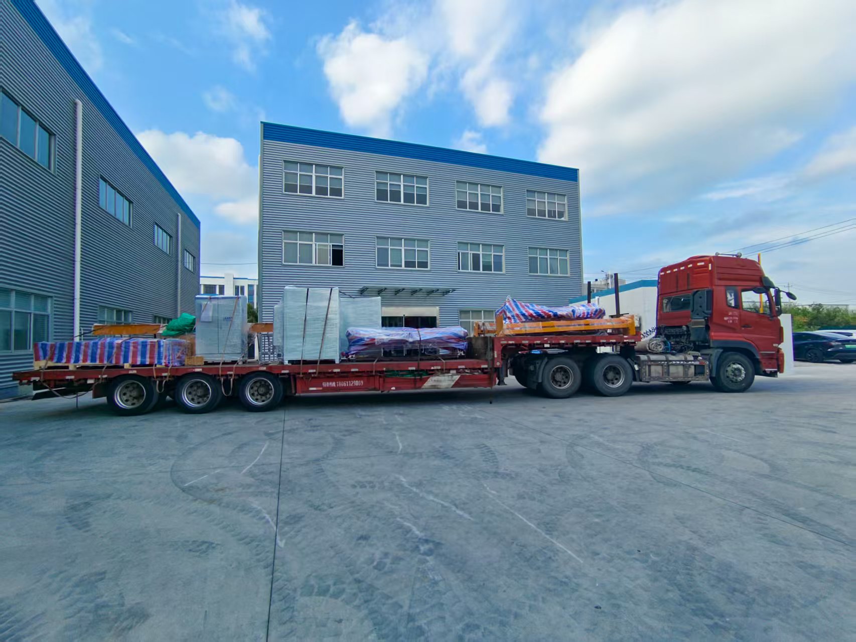 此次发运的丝印连线,整线总长31米,总高3.5米,总宽6.5米。为满足运输需求,设备经模块化设计与拆分,由4辆17.5米拖挂车统一承运至福耀苏州工厂。在发运前,改连线设备已在杰仕特工厂完成 2款星空顶玻璃、200余片样品的试制验证,充分确保了整线的工艺精度与运行稳定性。